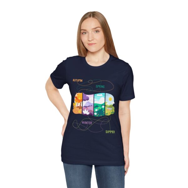 Celebrate the beauty of every season with the 4 Seasons Unisex Jersey Short Sleeve Tee. Featuring a unique design representing the cycle of nature, this tee is perfect for nature lovers and those who appreciate the changing landscapes throughout the year.