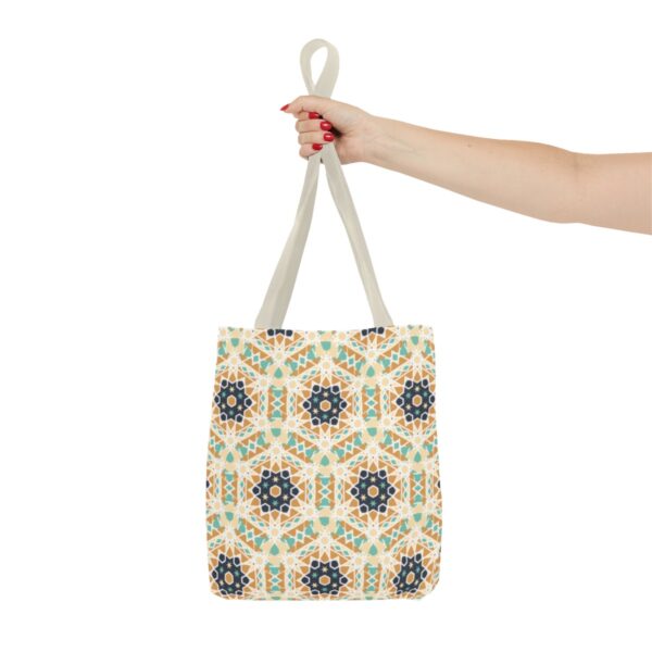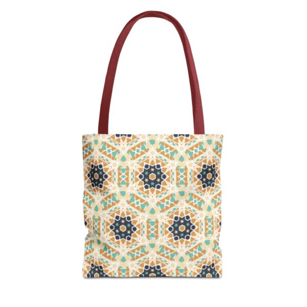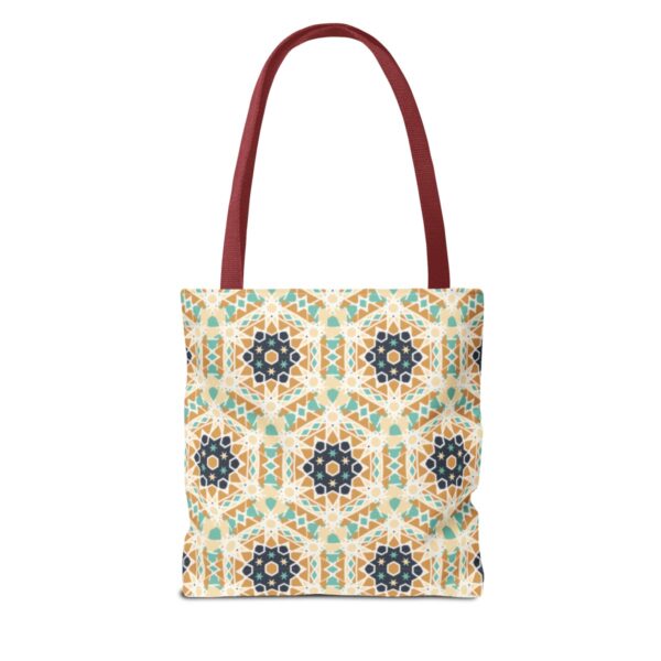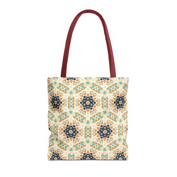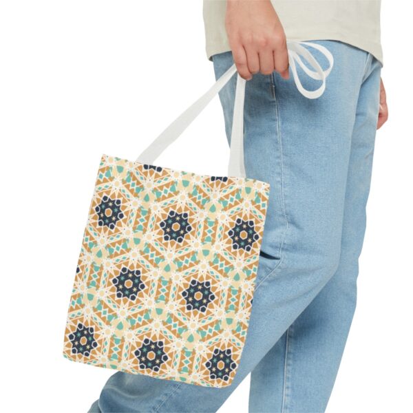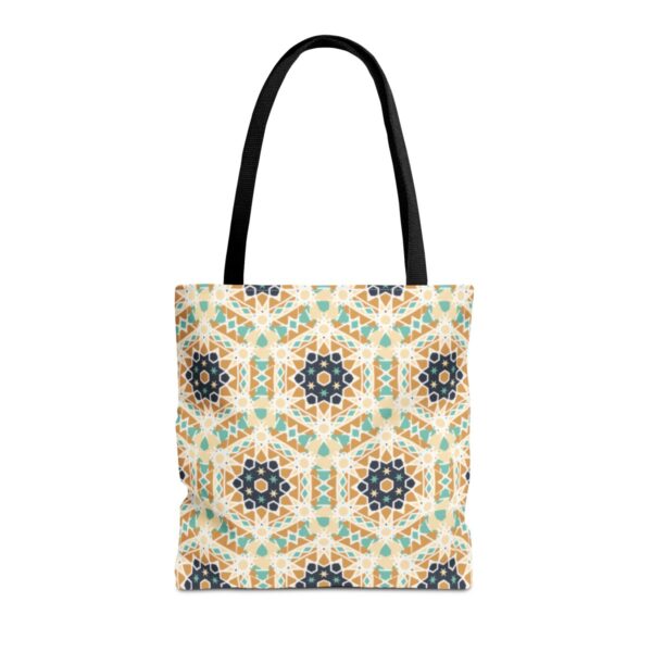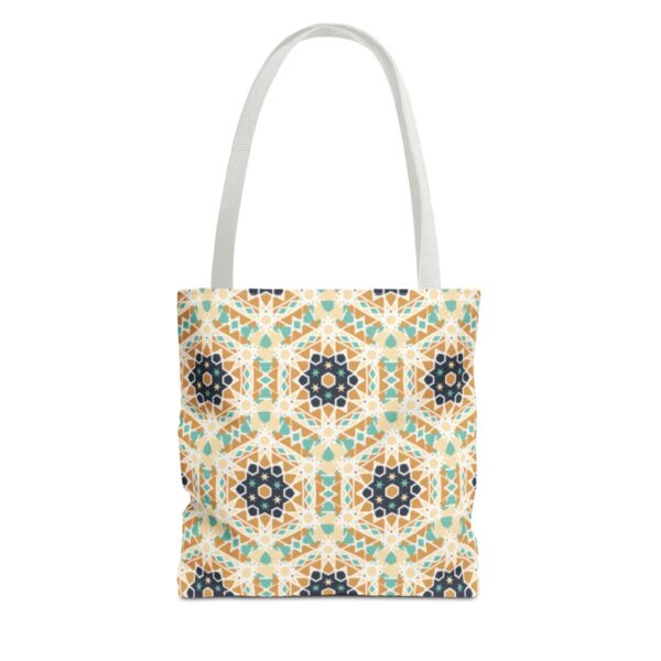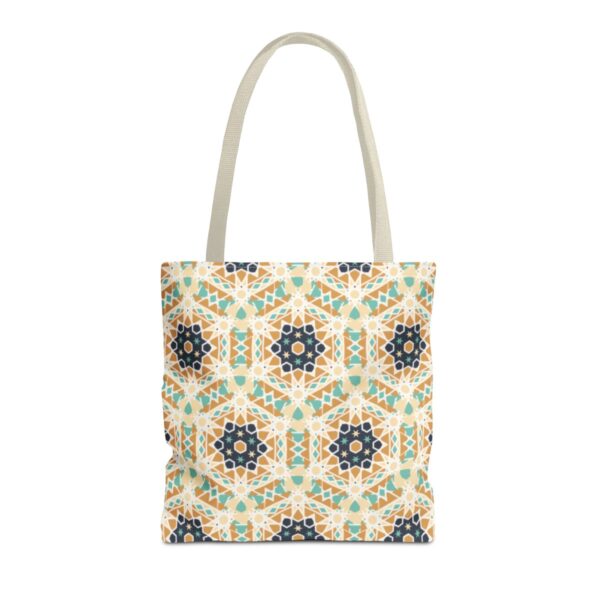 Designed with comfortable shoulder straps and a lightweight build, this tote bag is easy to carry wherever you go. The all-over print (AOP) ensures the intricate Arabic blue mosaic pattern is showcased beautifully from every angle, making it a standout accessory.